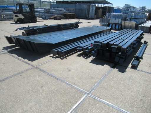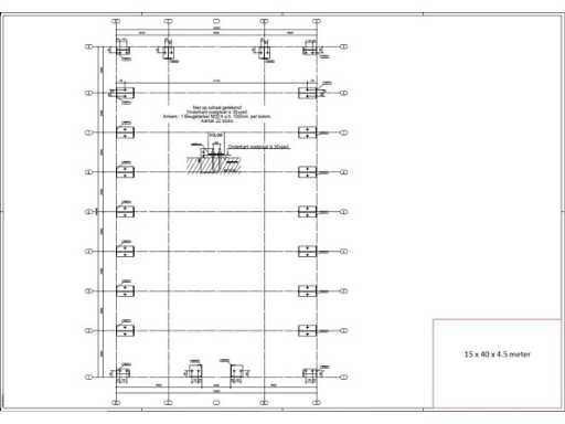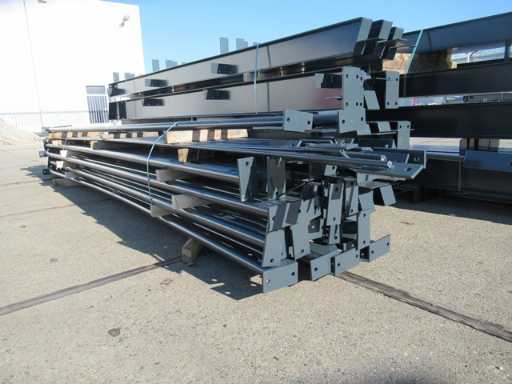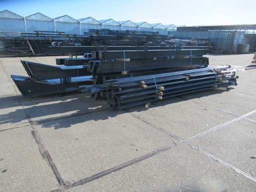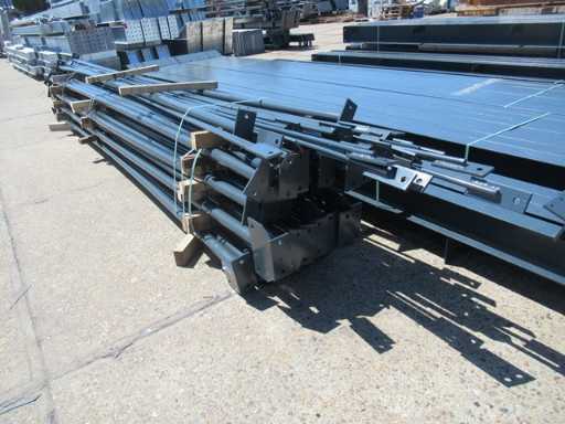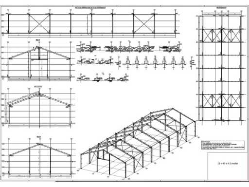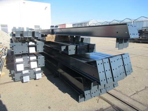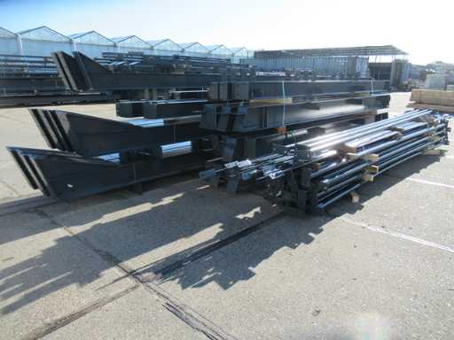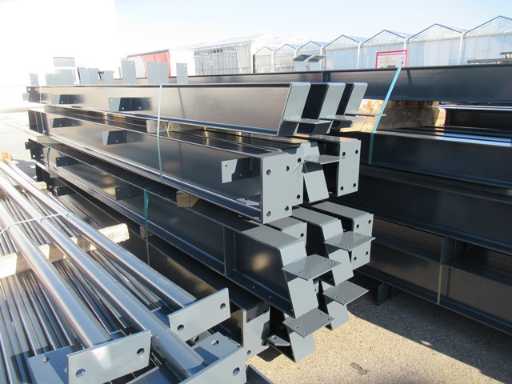 producția olandeză; deschidere liberă; ferme C.O.H. 5000mm; calcule de oțel; desene din oțel; desene de asamblare; planul ancorei; oțelul numerotat conform planului de asamblare; panta acoperișului de 20 de grade; 7 seturi de ferme intermediare IPE 270/240; 2 seturi de ferme IPE 200/180 la capăt cu stâlpi de vânt, dintre care un set este echipat cu o adâncitură pentru ușă; echipată cu tuburi de presiune; sprijinirea vântului; buze purlin; piulițe și șuruburi; ancore de descărcare; construcție din oțel conform standardului de produs EN1090 (certificat disponibil după achiziție); Parcarea este ordonat gata de transport și trebuie ridicată cu o singură remorci; Lotul este încărcat gratuit cu un stivuitor
