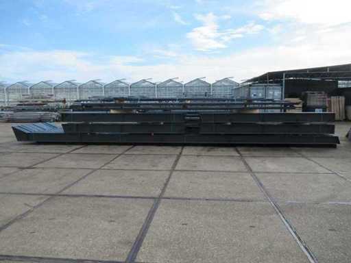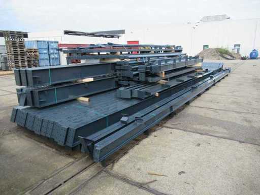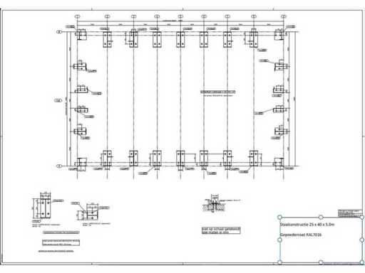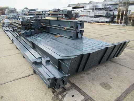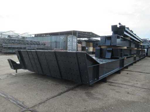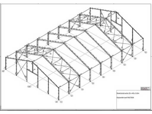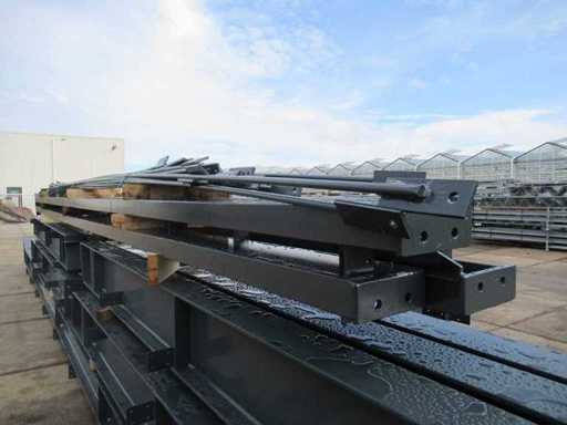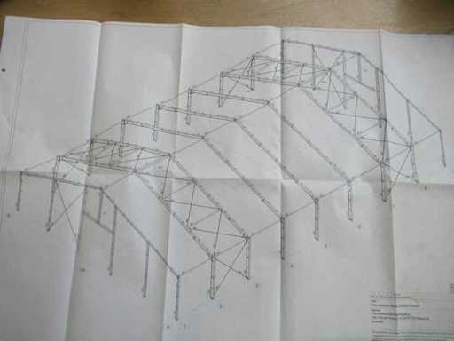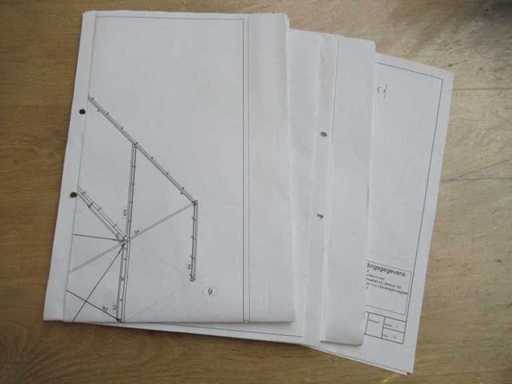 producția olandeză; deschidere liberă; ferme C.O.H. 5000mm; calcule de oțel; desene din oțel; desene de asamblare; planul ancorei; oțelul numerotat conform planului de asamblare; panta acoperișului de 20 de grade; 7 seturi de ferme intermediare IPE360/300; 2 seturi de ferme IPE 200/180 la capăt cu stâlpi de vânt, dintre care un set este echipat cu o adâncitură pentru ușă; echipată cu tuburi de presiune; sprijinirea vântului; buze purlin; piulițe și șuruburi; ancore de descărcare; construcție din oțel conform standardului de produs EN1090 (certificat disponibil după achiziție); Parcarea este ordonat gata de transport și trebuie ridicată cu o singură remorci; Lotul este încărcat gratuit cu un stivuitor