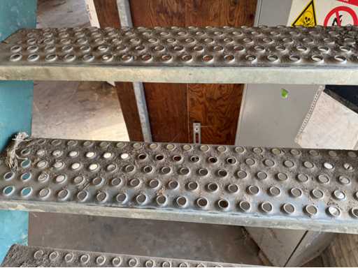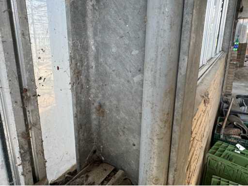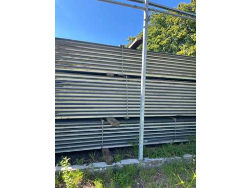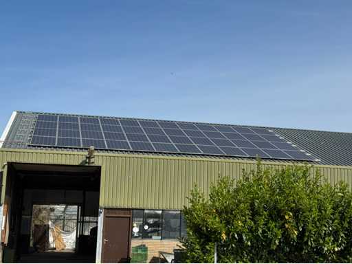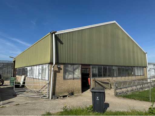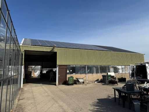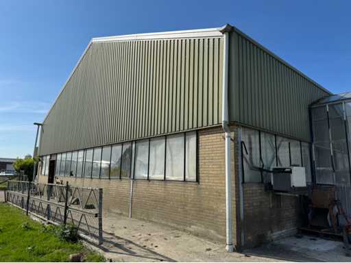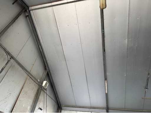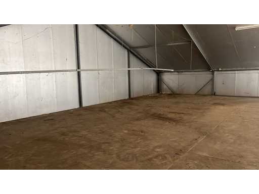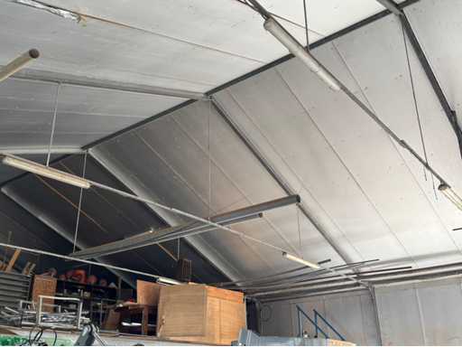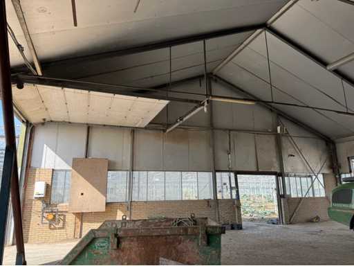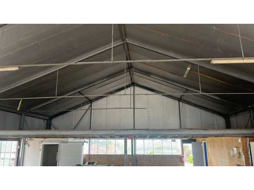 Construcție galvanizată întreagă; deschidere liberă de 14700 mm; 5 compartimente de 4000 mm; construcție totală de 20000 mm lungime; coloane cu grinzi IPE 180; picioare de truss IPE 180; coloanele fațadelor de la capăt IPE 140; fâșii de sprijin fațada 60x4 mm; cu o ușă superioară de 3570 mm lățime și 4020 mm înălțime; ușă manuală; acoperiș cu conducte de presiune; acoperiș cu plăci de izolație; Fațadele sunt parțial incluse; mansardă de 14700 mm lățime și 8200 mm adâncime; Înălțimea podelei este de 2670 mm; coloanele HEA 120; grinzi de oțel IPE 220; țeluri din lemn de 220x 78 mm; podea de lemn din scânduri de fund; cu scări de oțel; panouri solare 48 de piese; panourile de acoperiș au aproximativ 2,5 ani și panouri sandwich izolate; 1 invertor PCS; este demontat și pregătit pentru transport de către vânzător;