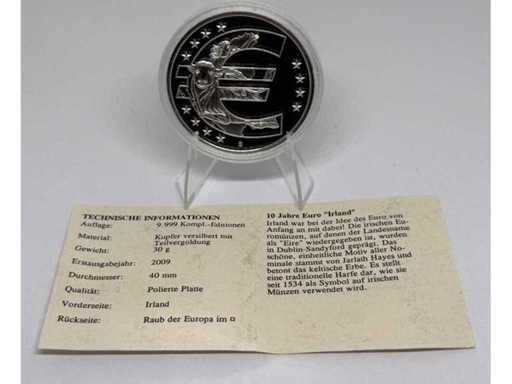 Cupru placat argint cu placare parțială în aur – monedă comemorativă Irlanda de 10 Euro, diametru 40 mm.