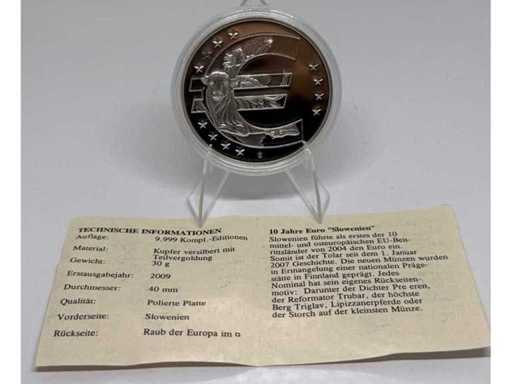 Cupru placat cu argint și placat parțial cu aur – monedă comemorativă slovenă de 10 euro, diametru de 40 mm.