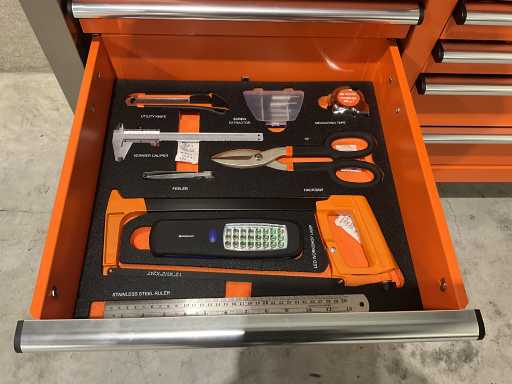 Lampă LED, fierăstrău, foarfecă, cuțit, unelte de măsurare