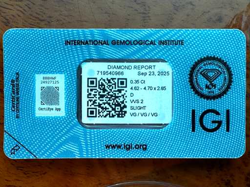 Diamant: Natural; Cantitate: 1 bucată; Tăietură: Tăietură genială; Greutate (carate): 0,35 carate; Culoare: D; Puritate: VVS2; Tăietură: Foarte bine; Certificat: IGI; Numărul certificatului: 719540966; Informații suplimentare: Acest diamant este un adevărat diamant Starcut; Starea: Nouă; Ambalare: Vine cu o cutie cu pietre prețioase; Explicație: Calitatea a fost preluată din raportul aferent produsului. Evaluarea este o evaluare a unui comerciant certificat de diamante, bazată pe prețurile pentru consumatori; Preț pentru consumatori: 5.280 €
