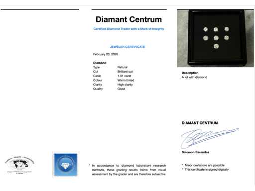 carate Diamant: Natural; Cantitate: 7 piese; Tăietură: Tăietură genială; Greutate (carate): 1,01 carate; Culoare: Nuanță caldă; Puritate: Puritate ridicată; Tăietură: Frumoasă; Starea: Nouă; Ambalare: Cutie cu pietre prețioase; Explicație: Calitatea a fost preluată din raportul aferent produsului. Evaluarea este o evaluare a unui comerciant certificat de diamante, bazată pe prețurile pentru consumatori; Informații suplimentare: Foarte potrivit pentru investiții și bijuterii; Preț pentru consumatori: € 3.960