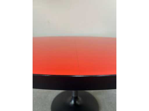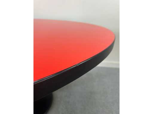 Masă rotundă Dietiker Elvețian, cu blat roșu și o bază metalică elegantă, stabilă. Designul combină calitatea elvețiană cu un aspect modern, ideal pentru săli de ședințe, cantine sau locuri de muncă creative.