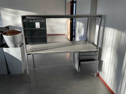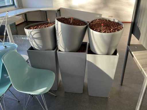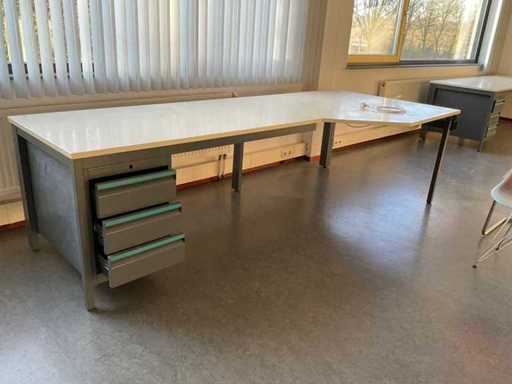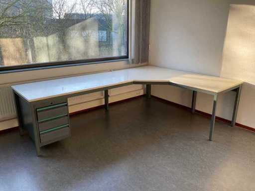 Constând din: (1x) masă de birou 2820x2020x760mm, (1x) masă de birou 2820x1210x760mm, (2x) masă de birou 1600x800x750mm, (6x) ghivece, (9x) fotolii de cantină, (5x) scaune în consolă, (1x) dulap, (1x) dulapură,