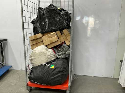 Conținutul căruciorului: Pânză de teatru alb-negru, suporturi pentru difuzoare, pungi de petrecere Prolyte x40 T piece (nefolosite)