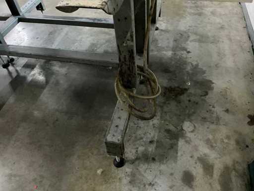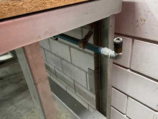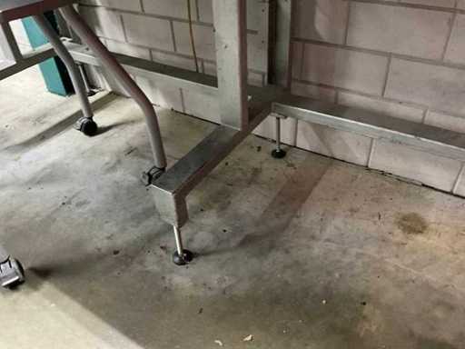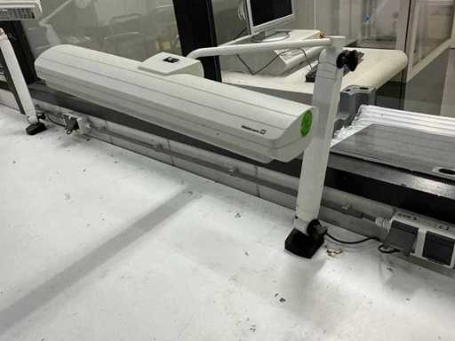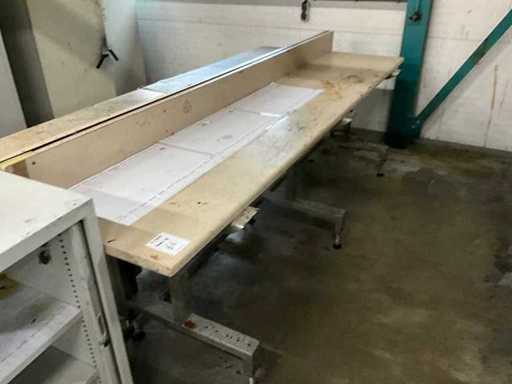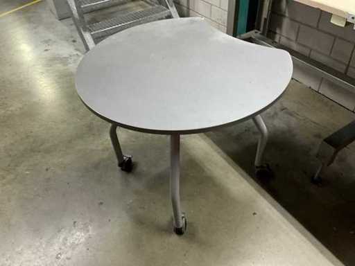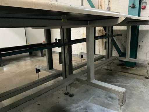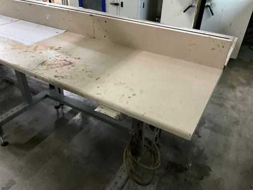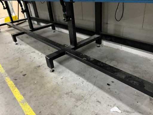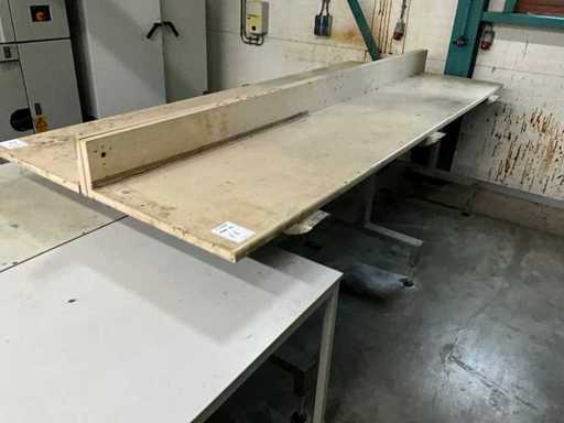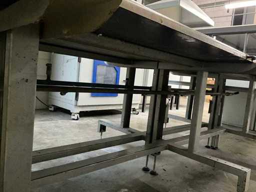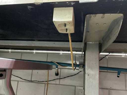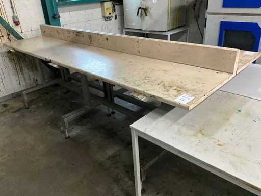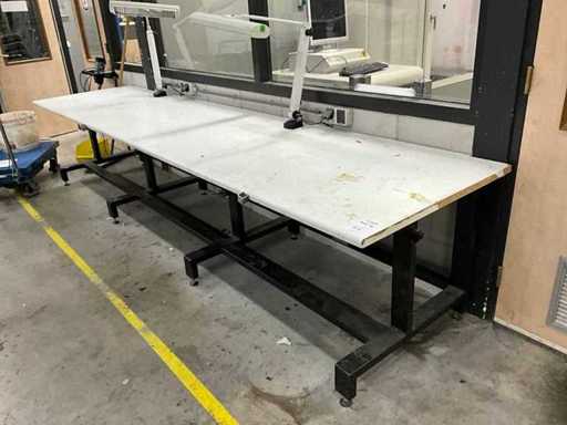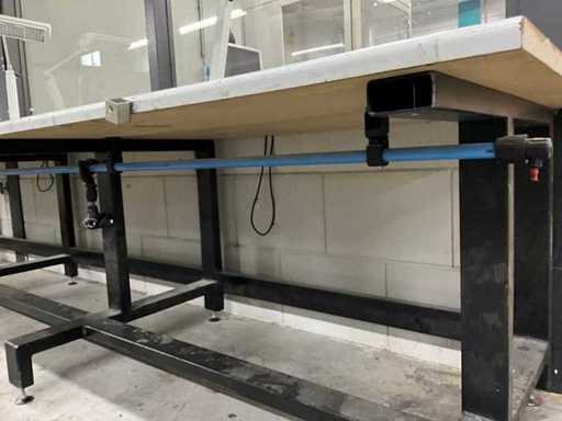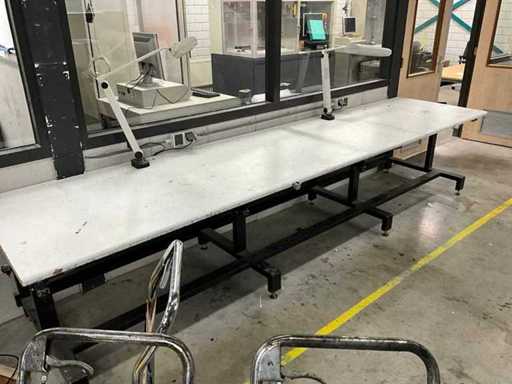(1x) masă de lucru 240x80x95cm cu powerpoint, (4x) masă de lucru 300x60cm înălțime 90-92cm cu margine din spate, (1x) 376x90cm 77,5cm înălțime cu (2x) lampă, cu conducte de aer, inclusiv: masă rotundă mobilă Ø 90cm x 75cm înălțime