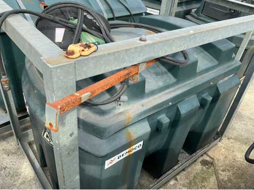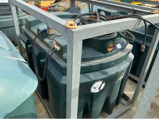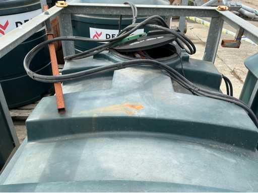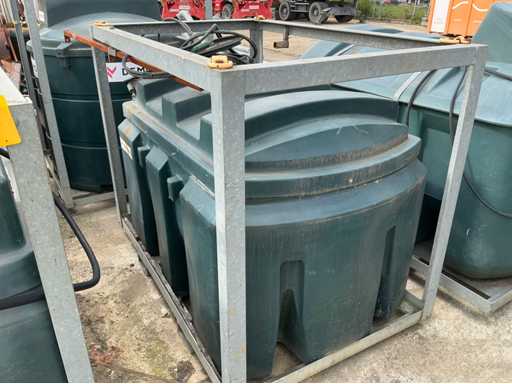 Mobile diesel tank in plastic version, suitable for diesel storage on site. Capacity approximately 2,500 litres, made of double-walled HDPE, with a sturdy steel transport cage equipped with lifting eyes and fork slippers.