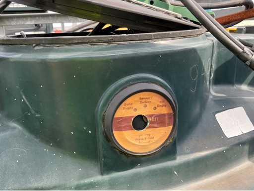 Equipped with electric pump (connection plug visible), hoses available. Visually used – frame with rust on mounting brackets, but plastic tank undamaged. Not cleaned or inspected, no certificate available, take it with you.