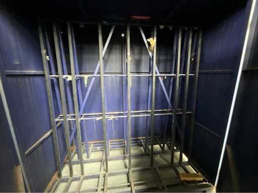 Echipată cu un vialet de sticlă de 2100x1000x2000 mm, 2 uși laterale, fante pentru lingură pentru stivuitor, ochi de ridicare