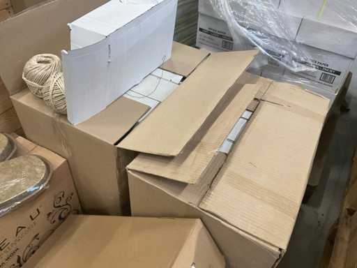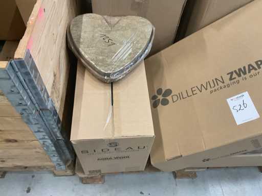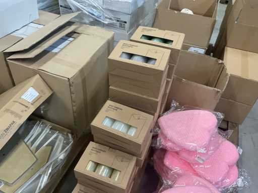 3 paleți inclusiv căni de cafea, ghivece pentru plante, lână Agra în formă de inimă, bile de frânghie, mâneci buchet 40x35x17 cm BOPP35, lumânări de ceară rustique în seturi de 3 în diferite culori, inimi deco roz 30 cm, decorațiuni pentru bebeluși etc.