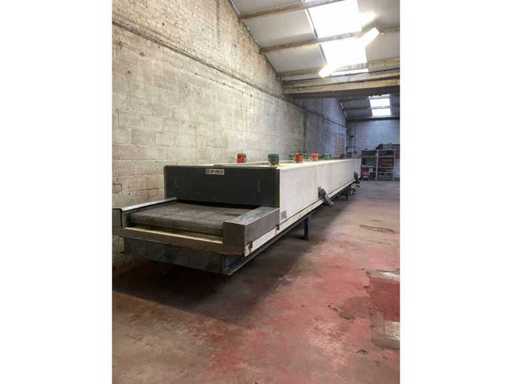 Type: Industrial Tunnel Freezer / Freezer Tunnel Condition: Used – fully working from running pizza base factory Suitable for: Food industry, bakery, frozen food, logistics, production lines and more Description Offered for sale: industrial freezer tunnel (tunnel freezer) from a production environment where it was actively used in a factory for the production of pizza bases. The machine is completely disassembled and ready for transport/installation by the buyer. This deep-freeze tunnel is designed for continuous and efficient freezing of products as they move through a controlled cold tunnel via a conveyor belt. Deep-freeze tunnels are used in industry to quickly and evenly bring products below 0 °C (often towards –18 °C or lower), maximizing quality, texture and shelf life during storage and distribution. Refrigeration system: (e.g. ammonia, compressor group, air or cryogenic cooling) Control: PLC / automatic control (if equipped) Materials: Stainless steel where product contact Includes: Input and output conveyors, control cabinets, fans / evaporators Main features & benefits Continuous production traffic: products are automatically transported through the tunnel and frozen. Uniform and fast freezing: reduces the formation of large ice crystals, maintaining texture and quality. Multifunctional: ideal for frozen pizzas, vegetables, meat, fish, fruit, bakery products, snacks and more. Industrial reliability: built for constant production environment and robust operation. Applications This deep-freeze tunnel is suitable for producers and processors in the food industry and can also be used within other sectors where continuous freezing is required, such as: Frozen and fast freeze production Food-processing lines Bakeries and dough production lines Distribution and logistics storage Product development and testing facilities This tunnel comes from a bankruptcy of a working factory — so it has been used consciously but functionally tested and can be used within an existing production line. With the right installation and connection, it can go straight back into production. Ready for collection in Eeklo. Delivered without installation in the final location — buyer takes care of transport and possible reinstallation/inspection.