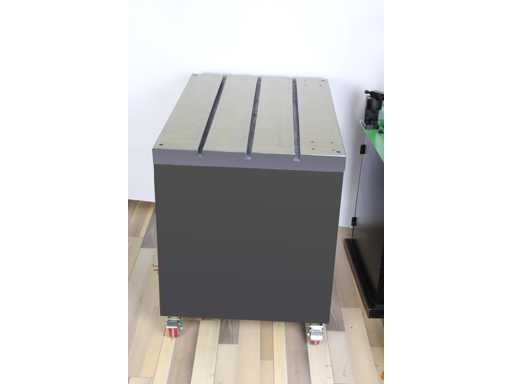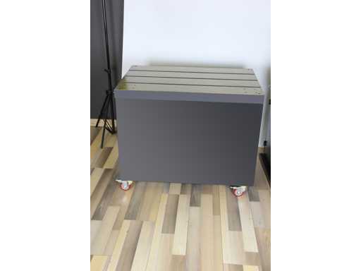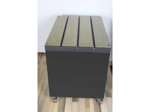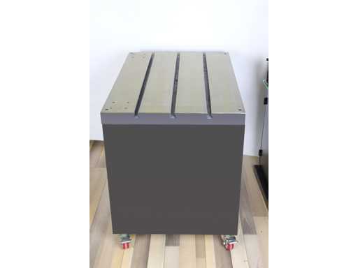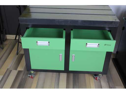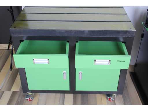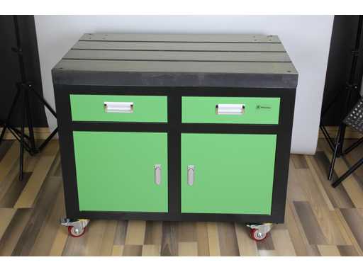 Heavy metal workshop cabinet with 2 doors and 2 drawers. Mounted on high load capacity wheels. Top size 900 x 600 mm, cabinet weight 85 kg