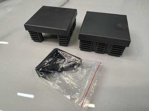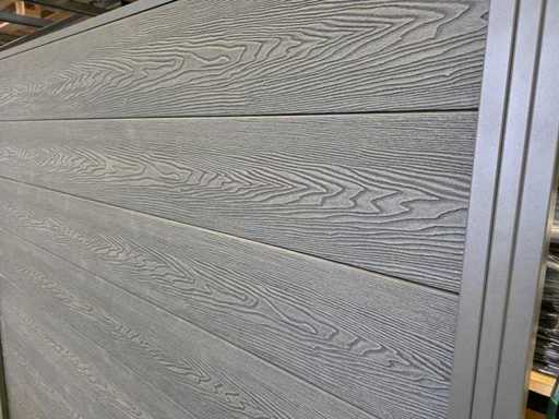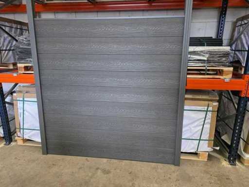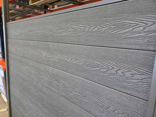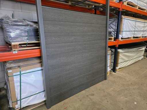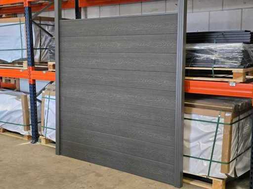 5 părți de gard din câte 9 scânduri, fiecare care alunecă una în alta, 6 stâlpi de protecție din aluminiu cu sistem glisant, stâlpii trebuie fixați în pământ. Suporturi asortate pentru fixarea rafturilor, capace pentru stâlpi, fâșie de finisare din aluminiu de jos și de sus,