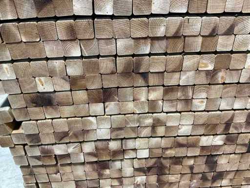 Grinzi de lemn moale cu dimensiuni de 35×35×2350 mm, rindeluite în jurul general (S4S) și executate cu margini rotunjite (R3) pentru un finisaj curat și o prelucrare plăcută. Grinzile sunt impregnate sub presiune (KDI) și colorate maro, ceea ce asigură o durabilitate și o adecvare sporită pentru aplicații în aer liber.