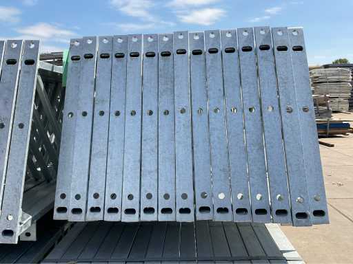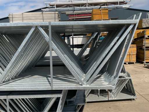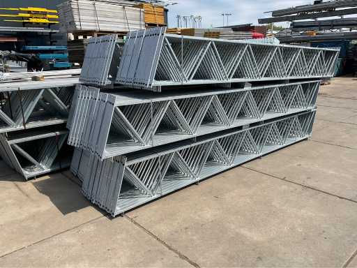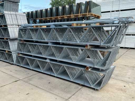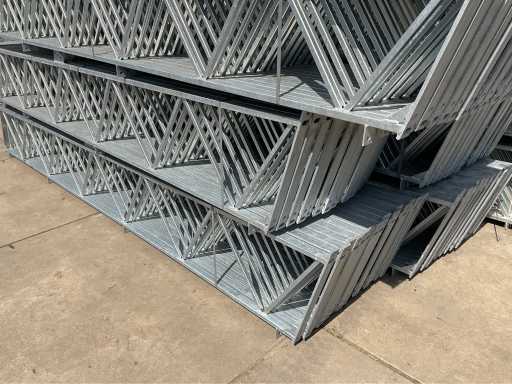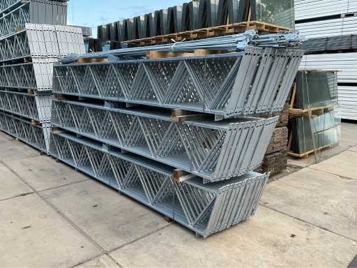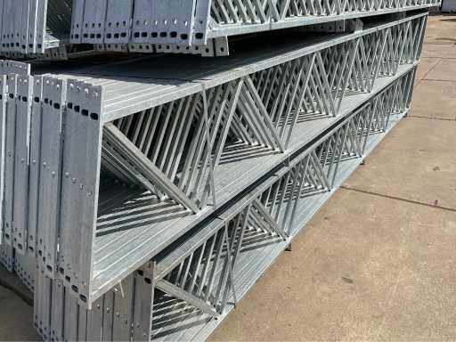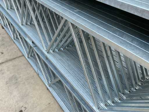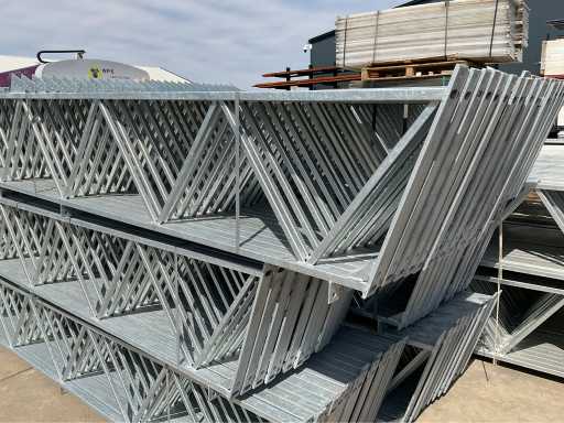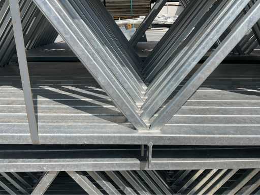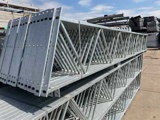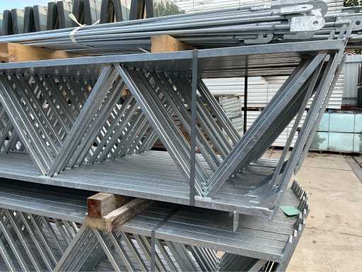 Nefolosit; oțel galvanizat; Lățimea / deschiderea acestor grinzi este de aproximativ 8000 mm. Acest lot implică 5 seturi de grinzi, deci 10 jumătăți grinzi care pot fi conectate în creastă