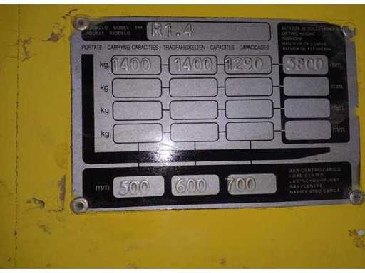 Model: R1.4 Capacitate nominală: 1400 kg Capacitate reziduală: 1290 kg Înălțime de ridicare: 5800 mm Centru de încărcare: 500 / 600 / 700 mm Ore de metru: 4439