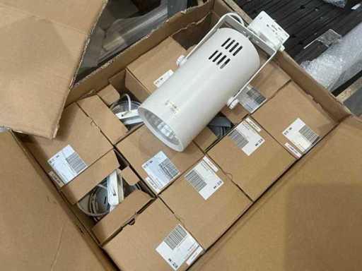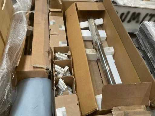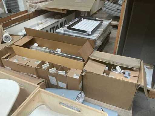 2 paleți care conțin diverse tipuri de iluminat, inclusiv trepied pentru porțile magazinelor (3x)