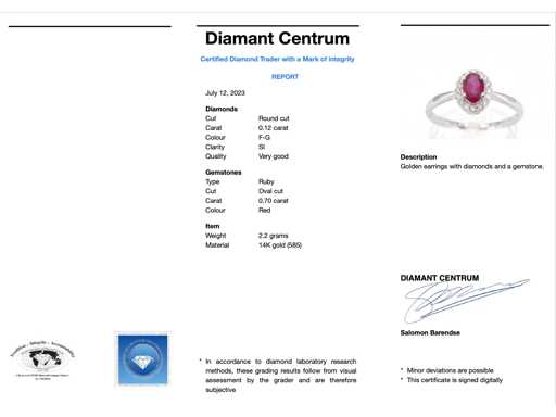 rubin Diamant: natural; Tăietură: Tăietură rotundă; Greutate (carate): 0,12 carate; Culoare: F-G; Puritate: SI; Calitatea tăieturii: Foarte frumoasă; Piatră prețioasă: Rubin; Tăietură: Oval; Greutate (carate): 0,70 carate; Culoare: roșu; Bijuterie: Inel; Greutate: 2,2 uncii; Dimensiunea inelului (realizat la comandă*): 54 (17,25 mm); Material: aur 14k (585); Starea: Nouă; Ambalare: Cutie de bijuterii de lux; Explicație: Calitatea a fost preluată din raportul aferent produsului. Evaluarea este o evaluare a unui comerciant certificat de diamante, bazată pe prețurile pentru consumatori; Preț de consum: € 1.908