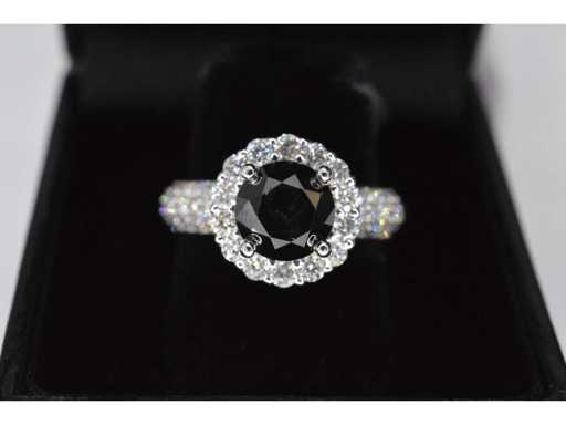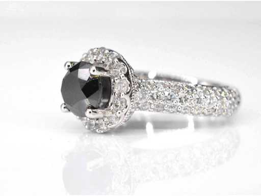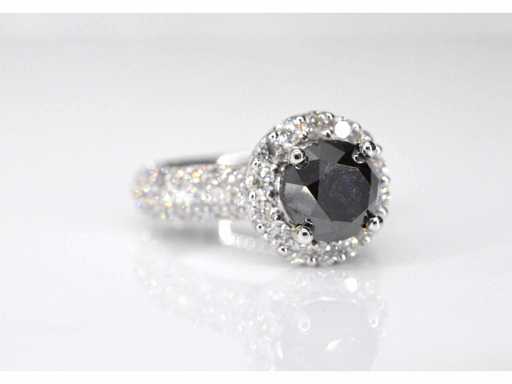Diamant: natural; Cantitate: 1 bucată; Tăietură: Tăietură genială; Greutate (carate): 2,50 carate; Culoare: Negru; Puritate: Opacă; Calitatea tăieturii: Foarte frumoasă; Diamant (secundar): Diamante albe; Tăietură: Tăietură genială; Greutate (carate): 2,50 carate; Culoare: F-G; Puritate: SUA; Tăietură: Foarte bine; Bijuterie: Inel; Greutate: 10,3 uncii; Dimensiunea inelului (realizată la comandă*): 53 (17 mm); Material: aur 18K (750); Starea: Nouă; Ambalare: Cutie de bijuterii de lux; Explicație: Calitatea a fost preluată din raportul aferent produsului. Evaluarea este o evaluare a unui comerciant certificat de diamante, bazată pe prețurile pentru consumatori; Preț pentru consumatori: € 12.950