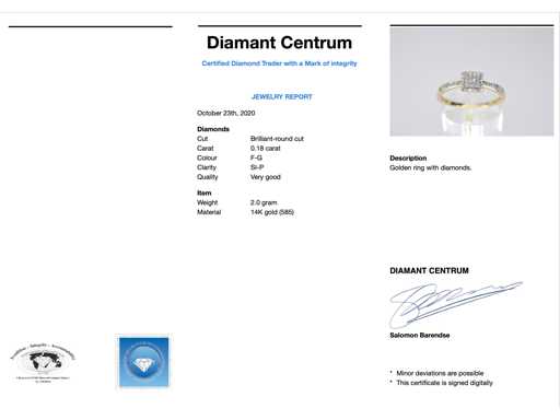 Diamant: Natural; Tăietură: Tăietură strălucitoare și rotundă; Greutate (carate): 0,18 carate; Culoare: F-G; Puritate: SI-P; Calitatea tăieturii: Foarte frumoasă; Bijuterie: Inel; Greutate: 2 grame; Dimensiunea inelului (realizat la comandă*): 54 (17,25 mm); Material: 14 carate (585); Starea: Nouă; Ambalare: Cutie de bijuterii de lux; Explicație: Calitatea a fost preluată din raportul aferent produsului. Evaluarea este o evaluare a unui comerciant certificat de diamante, bazată pe prețurile pentru consumatori; Preț pentru consumatori: € 1.383