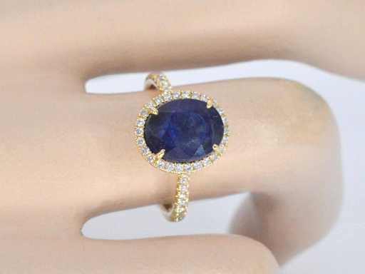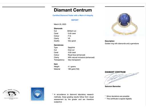 Diamant: Natural; Tăietură: Tăietură genială; Greutate (carate): 0,40 carate; Culoare: F-G; Puritate: SUA; Calitatea tăieturii: Foarte frumoasă; Piatră prețioasă: Safir; Cantitate: 1 bucată; Tăietură: Oval; Greutate (carate): 4,00 carate; Culoare: Albastru regal (îmbunătățit); Puritate: Cu incluziuni naturale (îmbunătățite); Dimensiuni: 10,0 x 8,0 mm; Bijuterie: Inel; Greutate: 4,1 uncii; Dimensiunea inelului (realizată la comandă*): 53 (17 mm); Material: aur 18K (750); Starea: Nouă; Ambalare: Cutie de bijuterii de lux; Explicație: Calitatea a fost preluată din raportul aferent produsului. Evaluarea este o evaluare a unui comerciant certificat de diamante, bazată pe prețurile pentru consumatori; Preț pentru consumatori: € 3.868