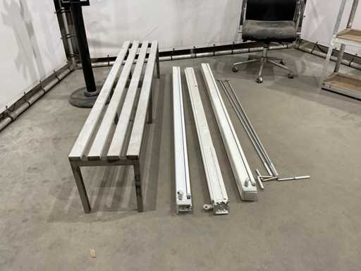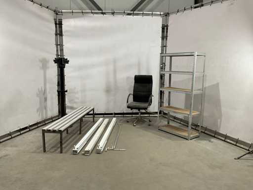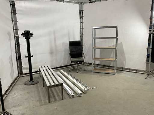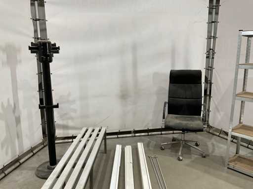 lotul constă din bancă de dressing; suport pentru haine; scaun de birou; raft de depozitare; 3x ecran de proiecție