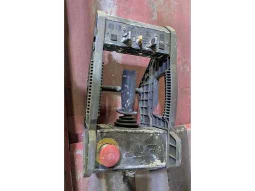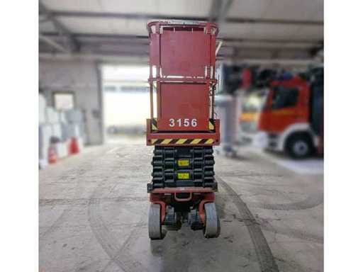 Nr. intern 3156, gardă la sol 0,09 m, capacitate de ridicare pe extensie 120 kg, lungimea peronului extinsă cu 3,20 m, poziție de transport la înălțime fără balustradă 1,86 m, anvelope albe, puncte de ancorare pentru sisteme de reținere (PPE) disponibile. Observați bateriile defecte, frâna blocată, funcție oferită,