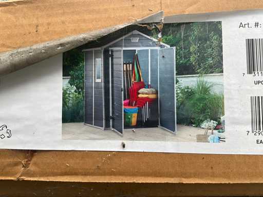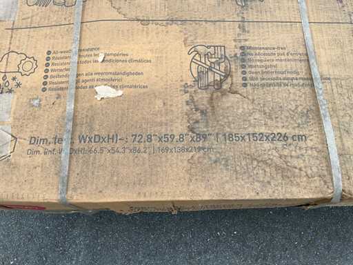 rășină + metal (construcție cu perete dublu, efect de aspect de lemn, fără întreținere); dimensiuni externe 185 × 152 × 226 cm; dimensiuni interne 169 × 138 × 219 cm; panou de podea integrat; uși duble; ferestre fixe (stil venețian) pentru lumină naturală; acoperiș în două ape cu încărcătură de zăpadă ± 75 kg/m²; Rezistent la intemperii și la culoare (rezistent la decolorare)