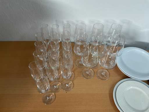 16 pahare de șampanie, 8 pahare de vin. 6 farfurii.