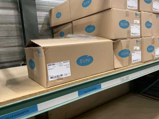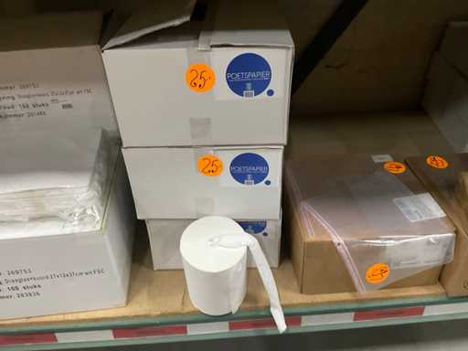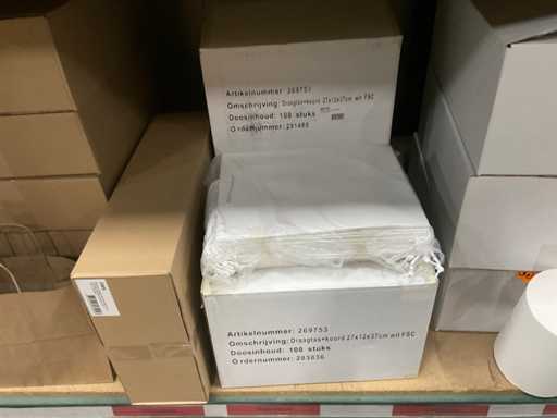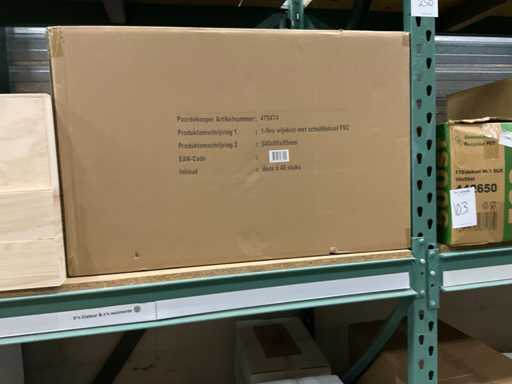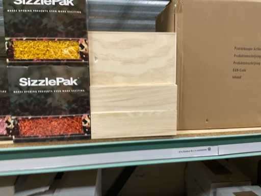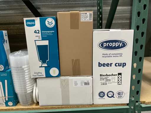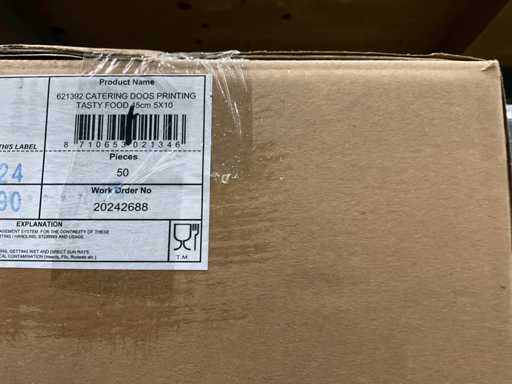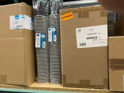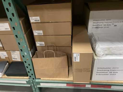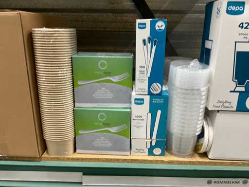 Conținutul 1 parte a raftului constând din pachet Sizzle, etichete, pungi de transport, hârtie de curățare, pungi de legume și fructe, cutii de vin, cutii de meniu, cutii de catering, tăvi de transport, bețișoare de zahăr, tăvi, capace și tacâmuri, cu excepția raftului.