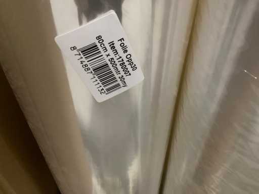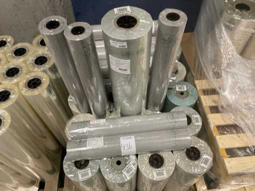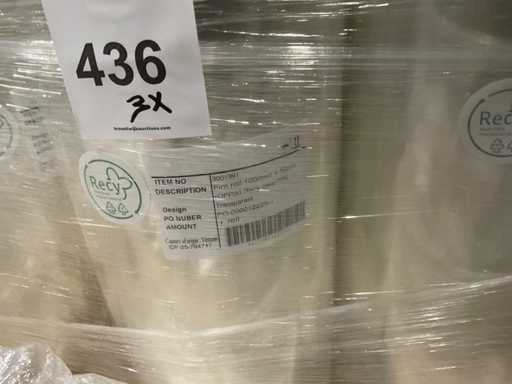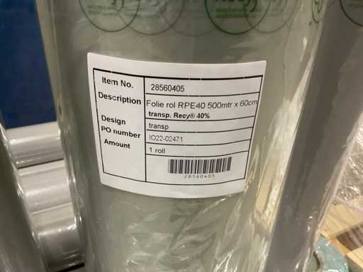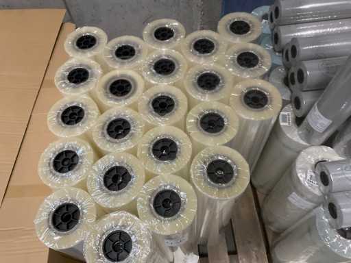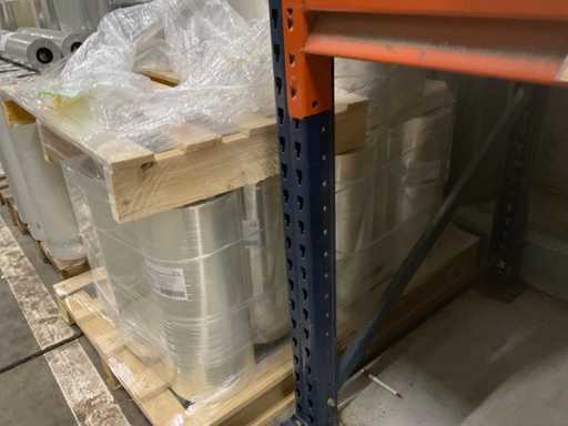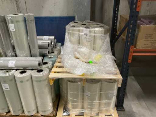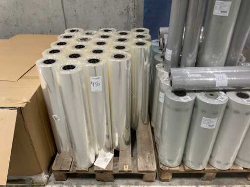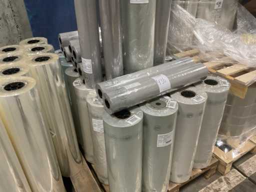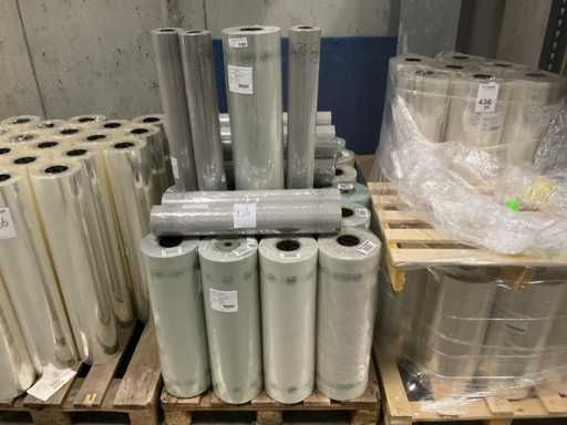 3 paleți, aproximativ 80 role, inclusiv folie transparentă, rolă Fim 1000m x 50cm, RPE40 500m x 60cm și folie OPP30 500m x 80cm, inclusiv paleți