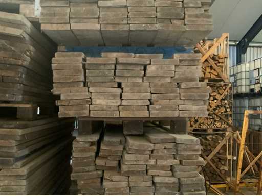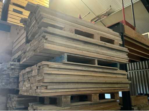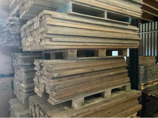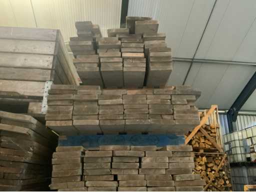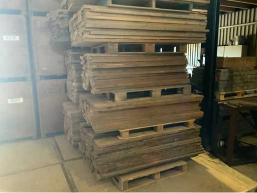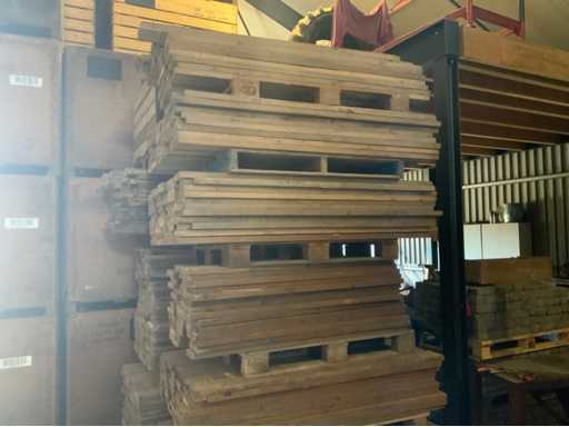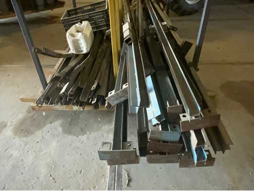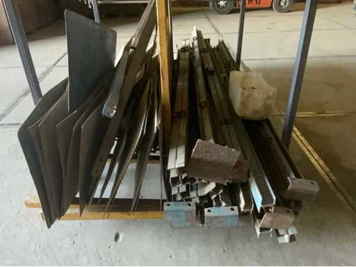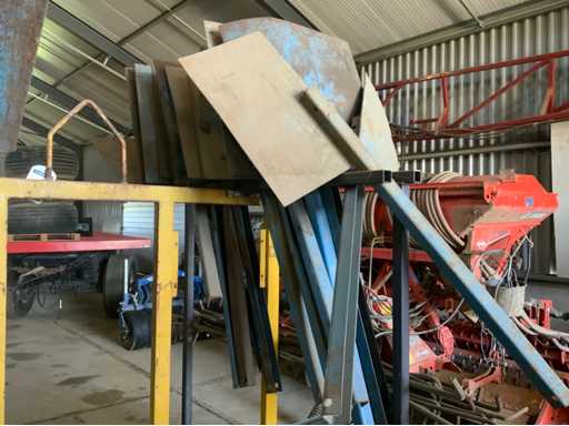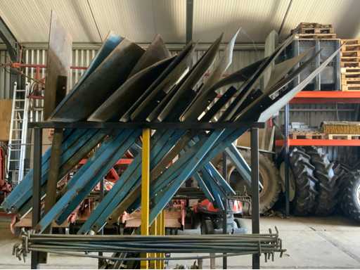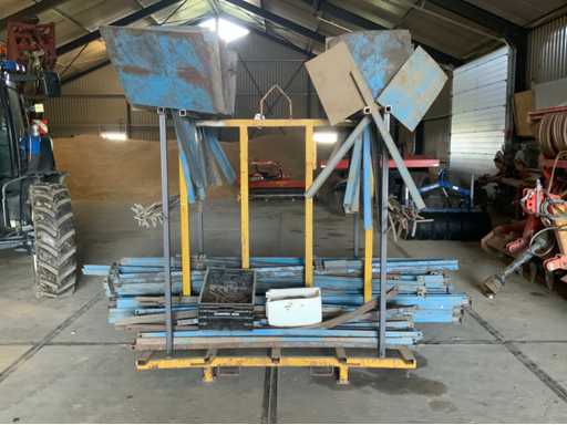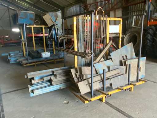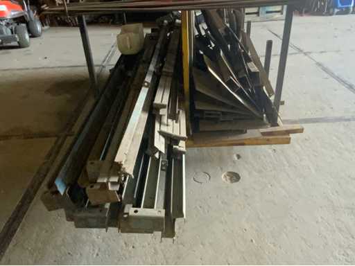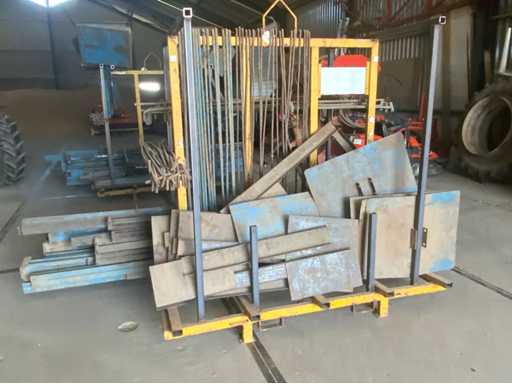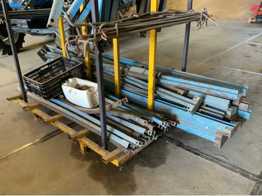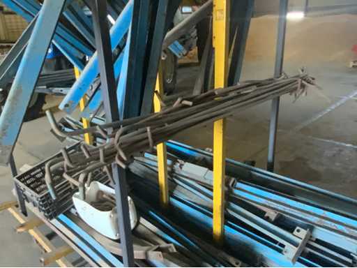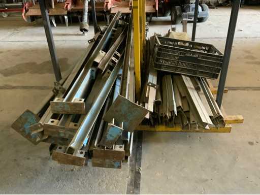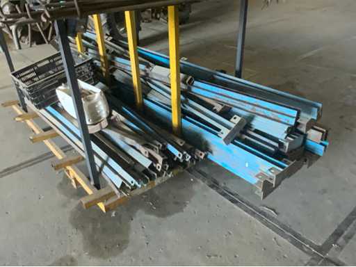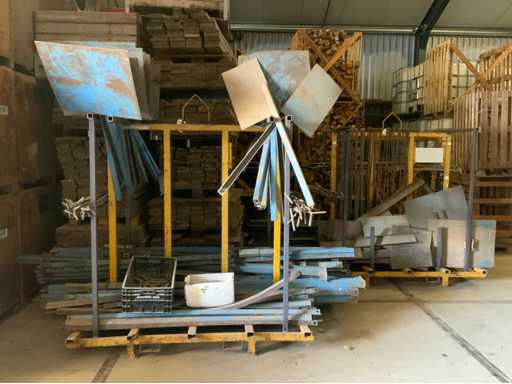 Format din 2 cavaleri de sticlă convertiți cu stâlpi, plăci de bază, tije de contravântuire și pereți de sprijin, 9 paleți cu plăci de sprijin, 2 colțuri, plăci de diferite lungimi de până la aproximativ 180cm, plăci sortate după lungime cu culoare.