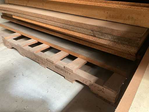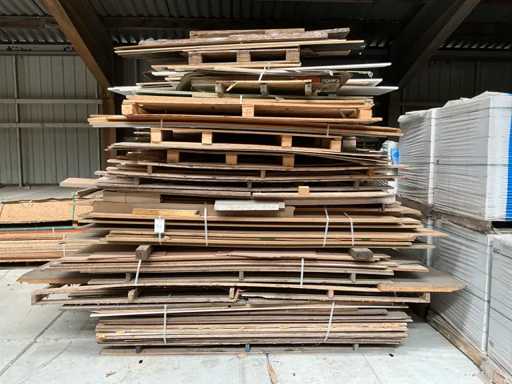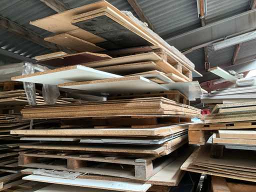 Pe 3 stive care includ mdf, carton de aglomerat, placaj, placaj de mobilier, placaj, în diverse dimensiuni și modele, dimensiuni pe stivă aproximativ 350x240x265 cm, 350x145x265 cm, 350x150x255 cm