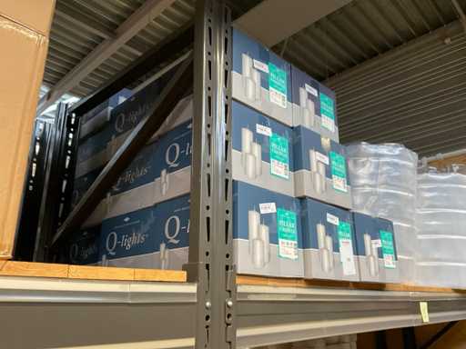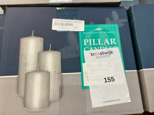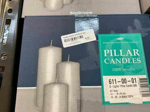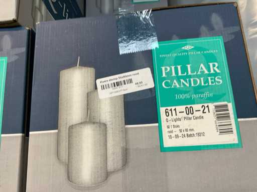Lumânări stubby în partea de sus a raftului, aproximativ 25 de cutii, diferite culori.