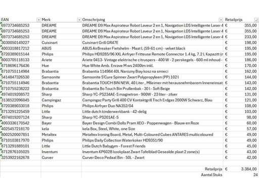 Este vorba despre un lot de produse returnate cu brandul A de la un mare retailer online. Lotul este format din diverse categorii de produse. Număr de piese: 24. Valoare de retail: €3384,- Neverificat: operațiune necunoscută (mix de