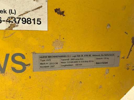 Echipat cu: Harwi HVS, număr mașină 2012 cm, an de construcție 2007, diametru pânză de ferăstrău 400mm, conexiune 380v, șină de nivel, capac de protecție, adâncime de ferăstrău reglabilă, unghi de tăiere reglabil, înălțime de tăiere standard 0-120mm, înălțime ferăstrău 45° înclinată 90 mm, lățime ferăstrău 0 - 760, diametru pânză de ferăstrău Ø 400, alezaj pânză de ferăstrău Ø 30 mm, reglare unghi 0 - 45°, dimensiuni blatul mesei 945 x 715 mm, înălțimea mesei 850 mm, putere motor 3,0 kW, tensiune de alimentare 400 V/3~, comutator principal 5P/32 A, comutator de lucru 32 A, viteză 2800 rpm, greutate 120 kg, lamă rotativă reglabilă până la 90°, ghidaj lateral pliabil din aluminiu cu conductivitate ridicată și scăzută, capac de protecție din policarbonat transparent cu racord 100 mm, capac de protecție / recipient de praf sub blat cu racord 75 mm, motor de frână, mânere și cârlige de robinet pentru transport.