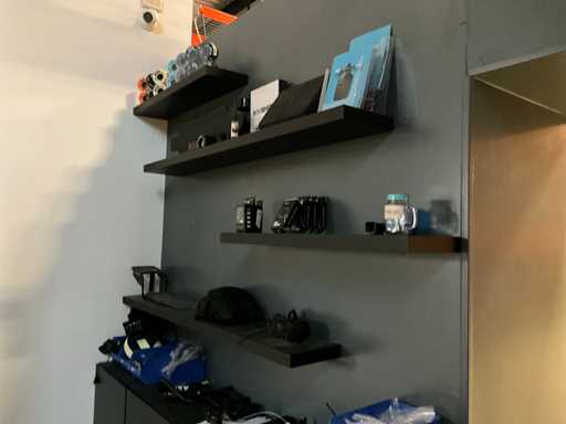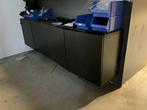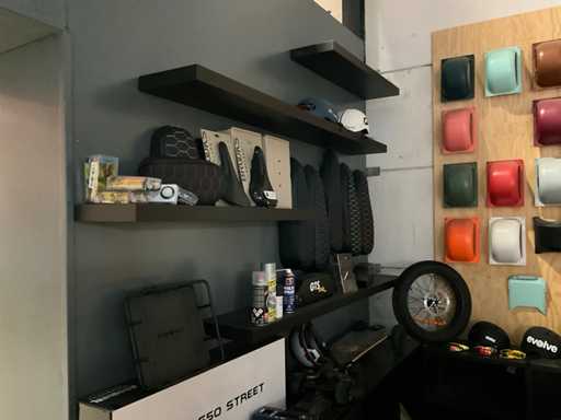 Format din 7 dulapuri (1200x400x640 mm), 4 rafturi de perete (1900x260x50mm) și 4 rafturi de perete (1100x260x50 mm). Peretele din spate este alcătuit din paleți, finisați cu Mdf (7050x870x3030) trecerea este de 2100 mm.