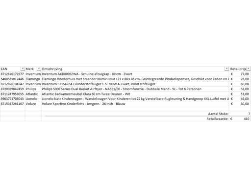 Este vorba despre un lot de produse returnate cu brandul A de la un mare retailer online. Lotul este format din diverse categorii de produse. Număr de piese: 7. Valoare de vânzare cu amănuntul: €1255,- Necontrolat: operațiune necunoscută (mix de