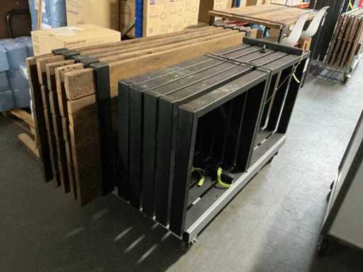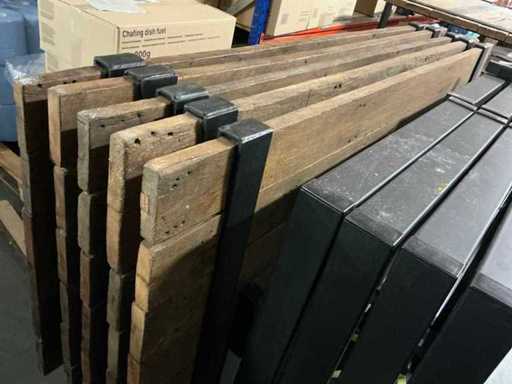Fotografie pentru ilustrație: blatul din lemn masiv, picioare din metal negru, inclusiv căruciorul de transport.