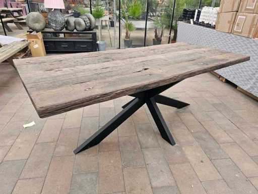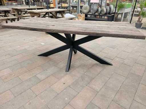Această masă impresionantă din lemn masiv combină farmecul rustic cu designul industrial modern. Blatul mesei, realizat din lemn plin de caracter, cu fibră vizibilă și trăsături naturale, face ca această piesă de mobilier să fie absolut unică. Blatul solid este susținut de un cadru robust, din metal negru, cu un aspect modern de păianjen, care asigură spațiu maxim pentru picioare și un suport sigur. O piesă cu adevărat statement pentru sala ta de mese sau sala de conferințe!
