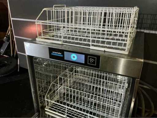 Mașină de spălat vase din sticlă Winterhalter UC Series cu 2 coșuri de spălat.