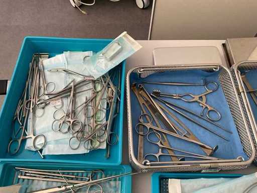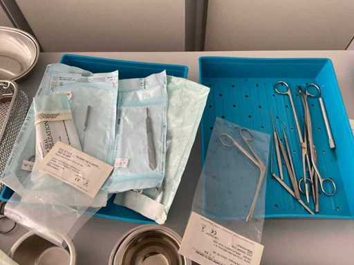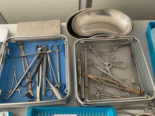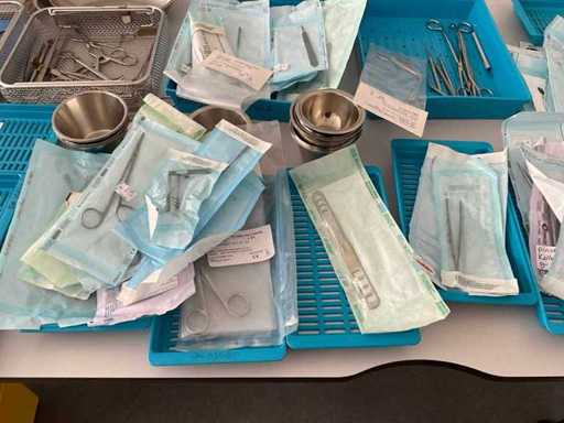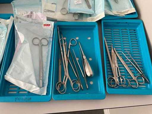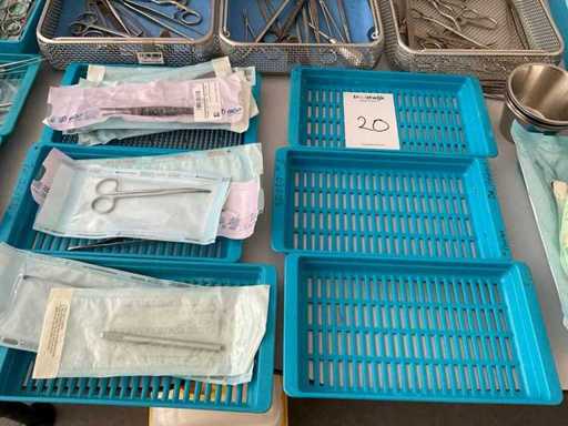 Constă din: foarfecă, clește, pensetă, bisturiu, recipiente pentru ace, inclusiv tăvi albastre.
