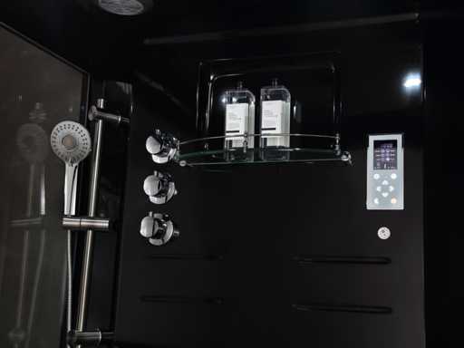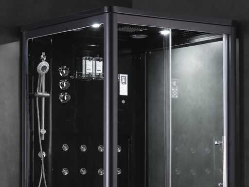 Duș manual (reglabil la înălțime cu bară glisantă). Ușa este echipată cu încuietori de calitate, protecție pentru funcționare uscată (generator de abur).