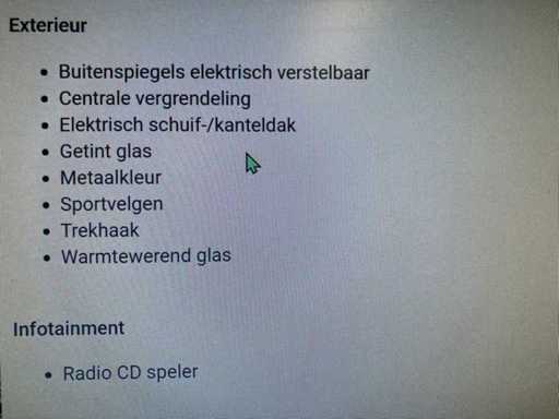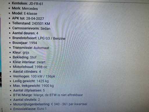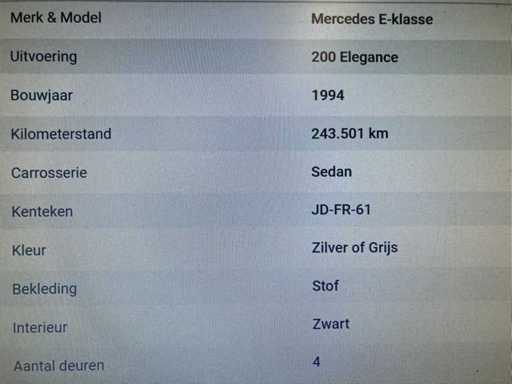 Mercedes E-class 200 Elegance 6-1994, cu instalație de gaz GPL prince destul de nouă, z.g.a.n. apk până pe 28-4-2027, pentru ani de plăcere la condus cu acest Mercedes solid, mașină originală olandeză, 100 KW și 136 CP Exterior Oglinzi exterioare reglabile electric Încuietori centralizați Acoperiș electric glisant/înclinat Sticlă fumurie Culoarea metalului Jante sport Bara de tractare Sticlă rezistentă la căldură Interior Cotieră de braț spate Geamuri electrice în față Geamuri electrice față și spate Cotieră centrală față Servodirecția Turometru Altele Sistem anti-blocare Airbagul șoferului Airbag pentru pasager Infotainment Radio CD player