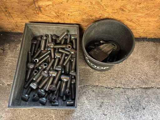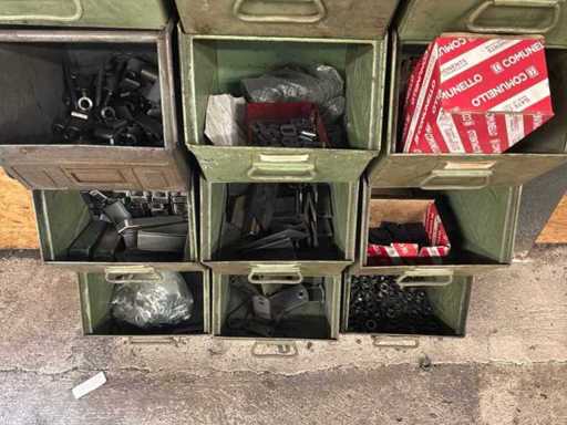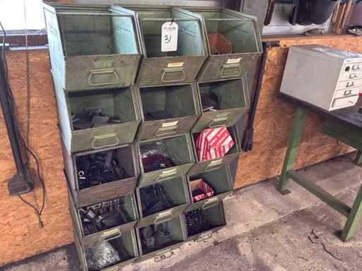 Various metal materials in 15 metal storage bins.