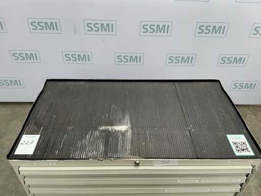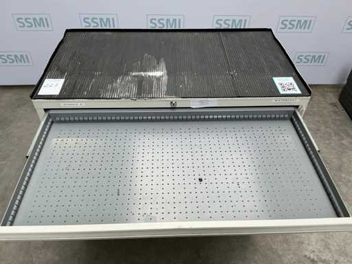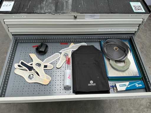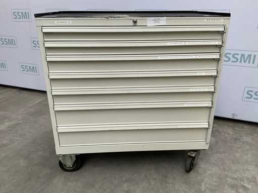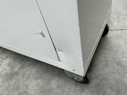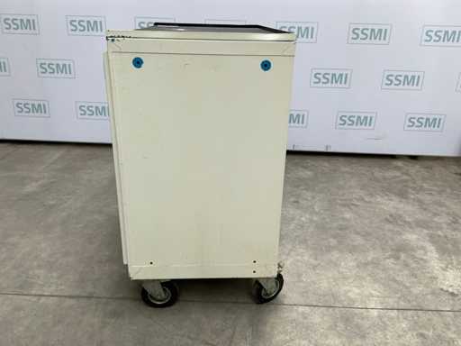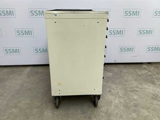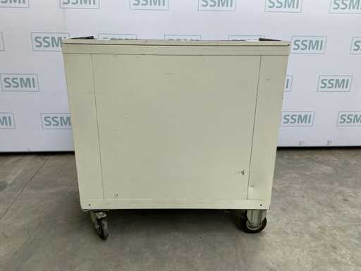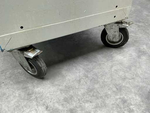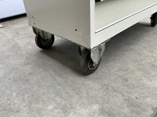 Equipped with 2 fixed transport wheels and 2 swivel ones with brakes; Cabinet with contents