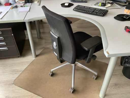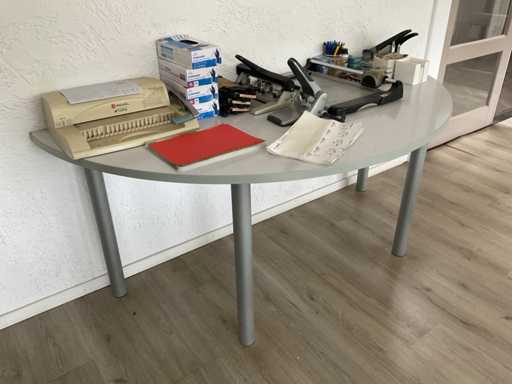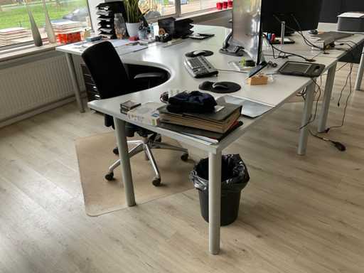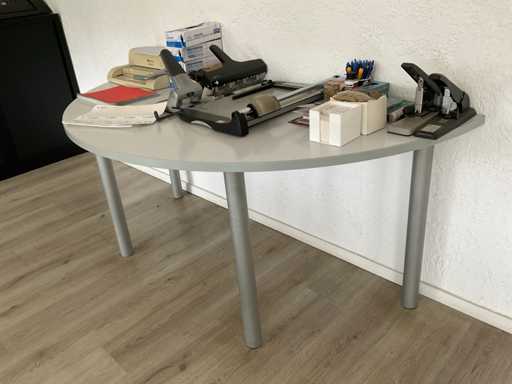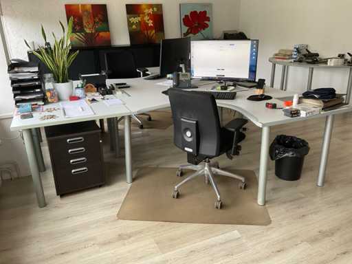 Compus din: birou de colț în două părți (165x258x75 cm) cu scaun, comodă mobilă, masă semicirculară suplimentară.