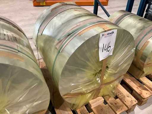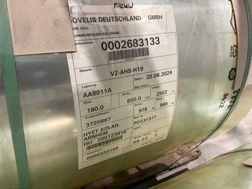 Fâșie de folie de aluminiu, grosimea foliei 0,18 milimetri, lățimea benzii 800 milimetri, lungime 2502 metri, aproximativ 970 kilograme pe rolă, 2 paleți